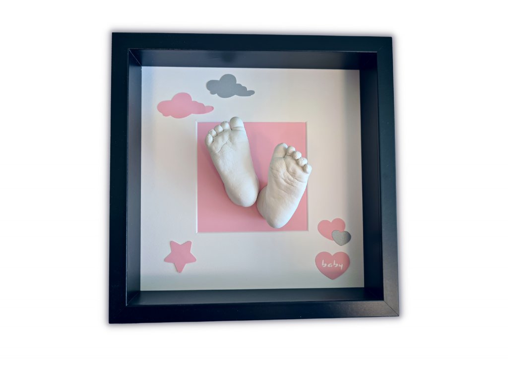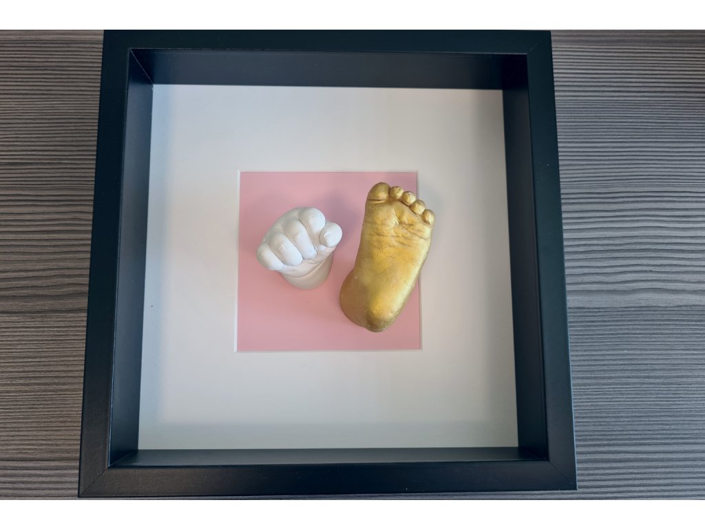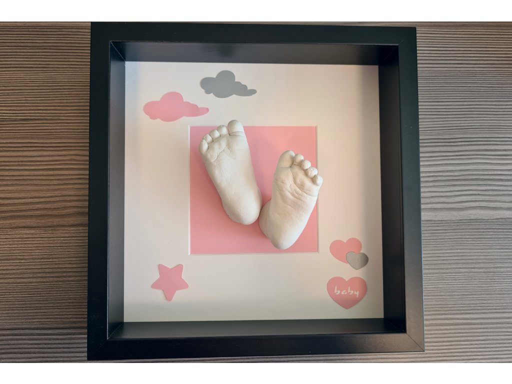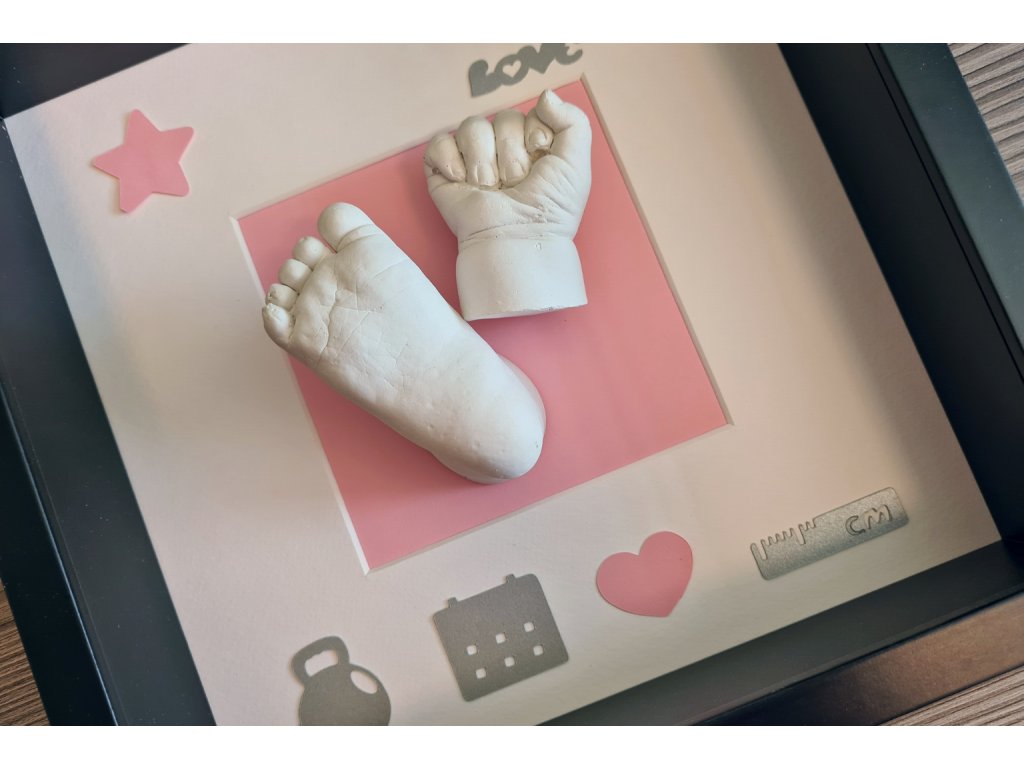 Rámeček je velký 25x25 cm, vejdou se do něj tak buď dvě nožičky, dvě ručičky nebo ručička a nožička. Jeho hloubka postačí na odlitky vysoké max 3 cm. Pokud jsou vaše odlitky větší a nechcete je již dále brousit, jednoduše nepoužívejte sklo rámečku. K rámečku je přiložena i pasparta, opět ji můžete ke tvoření využít nebo ji odstranit a odlitky naaranžovat spolu s fotkou miminka.