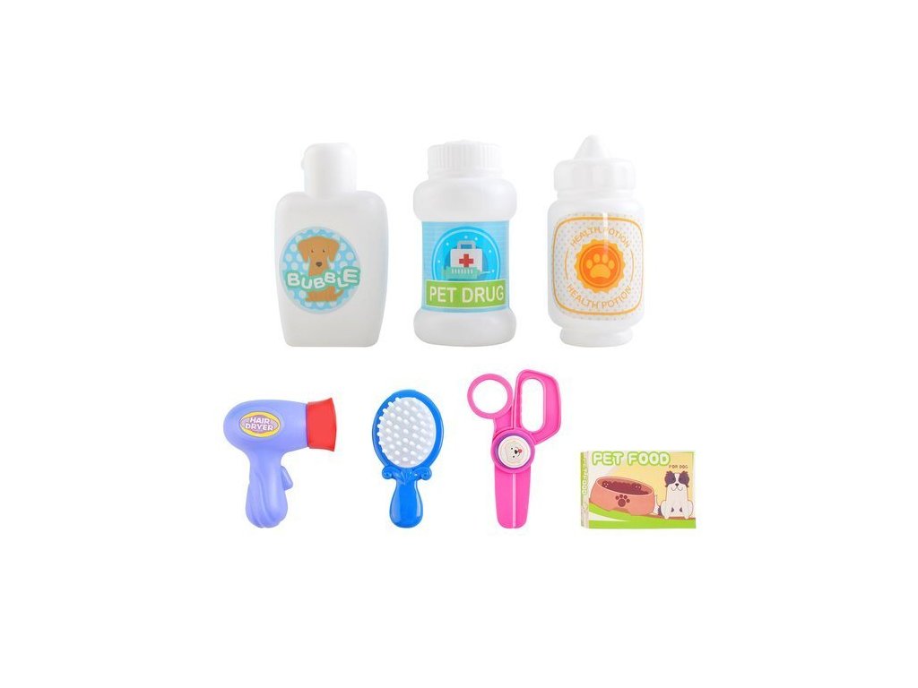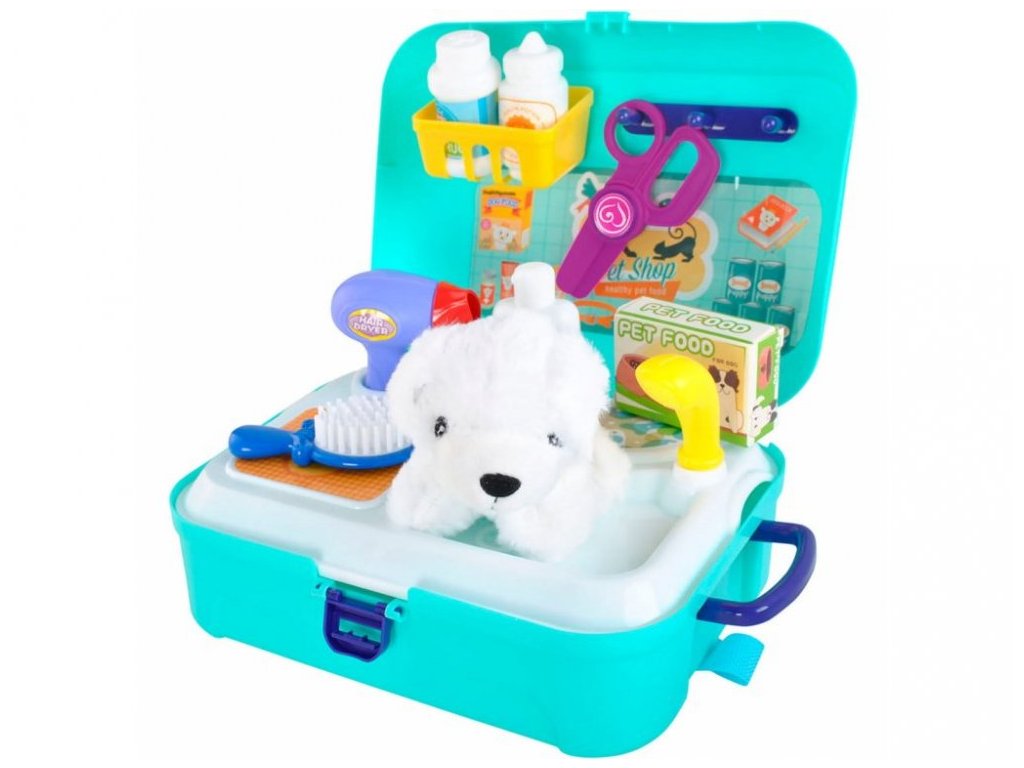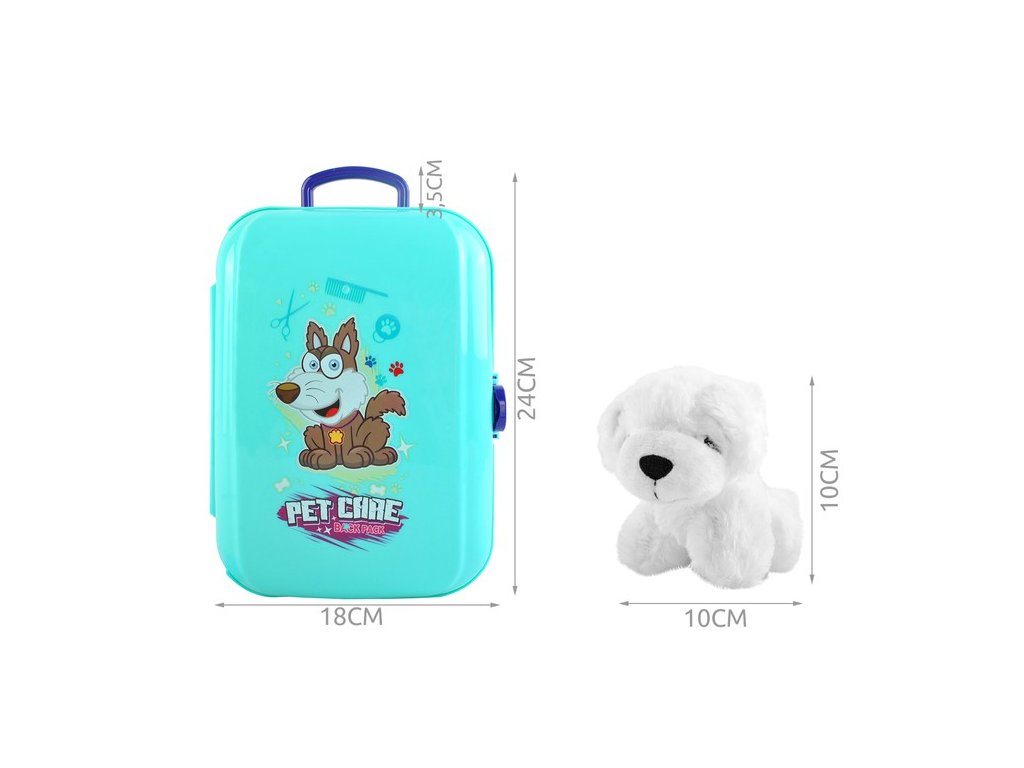 - Sada obsahuje: kufřík, plyšový pejsek, vanička se sprchou, fén, nůžky hřeben, krabička s jídlem, šampon, léky, polička