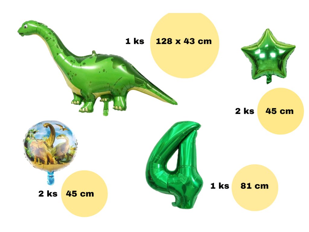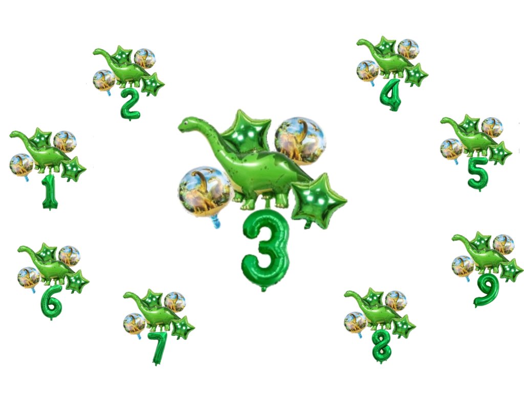 Set obsahuje celkem 7 ks balonků jako jsou na úvodním fotu, o různých velikostech - číslo měří cca 81 cm, dinosaur až 1,3 m