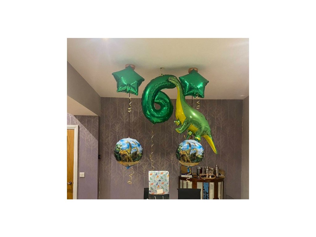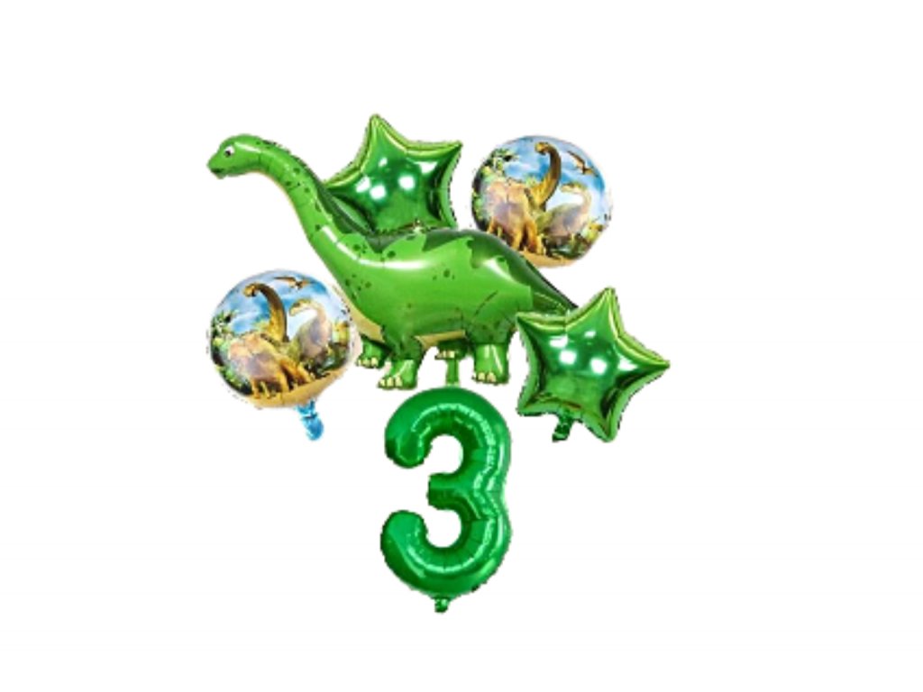 Set nádherných narozeninových balonků s Dinosaurem a se zlatým číslem, které nesmí chybět na narozeninové oslavě.
