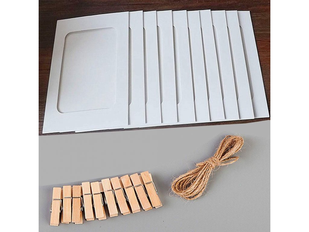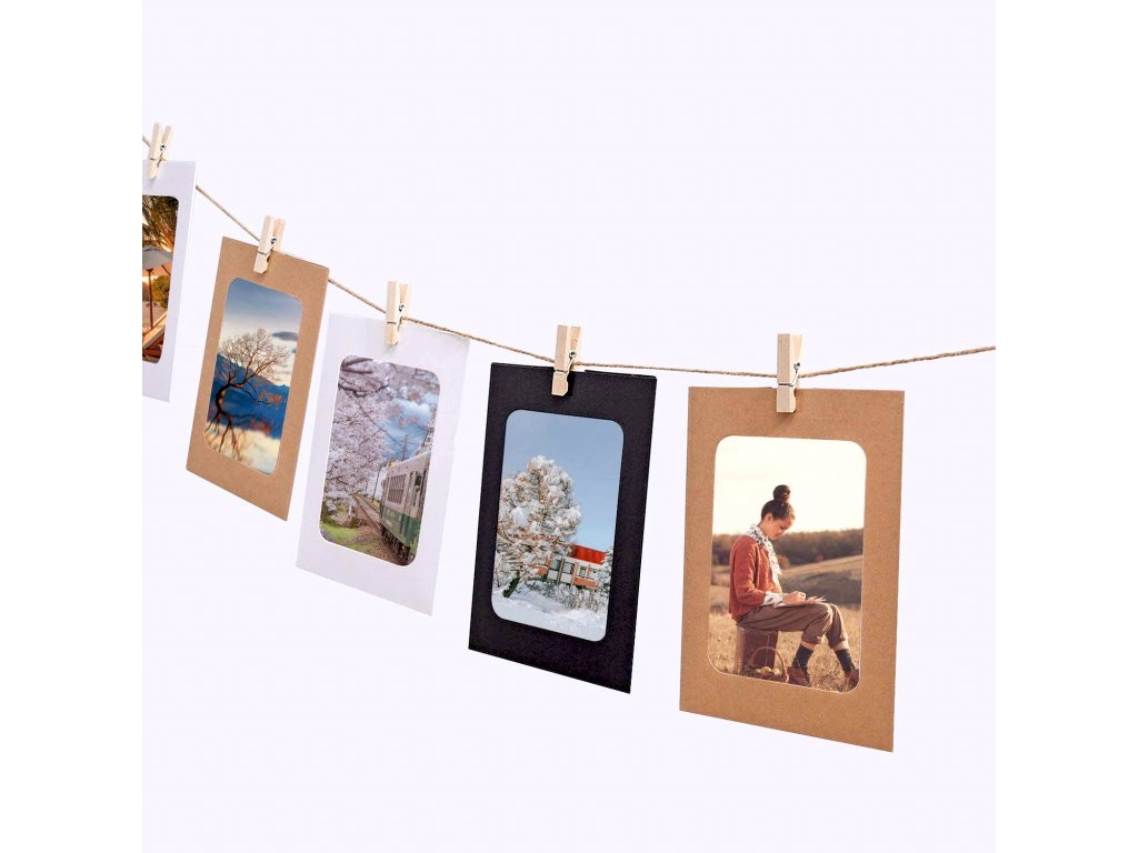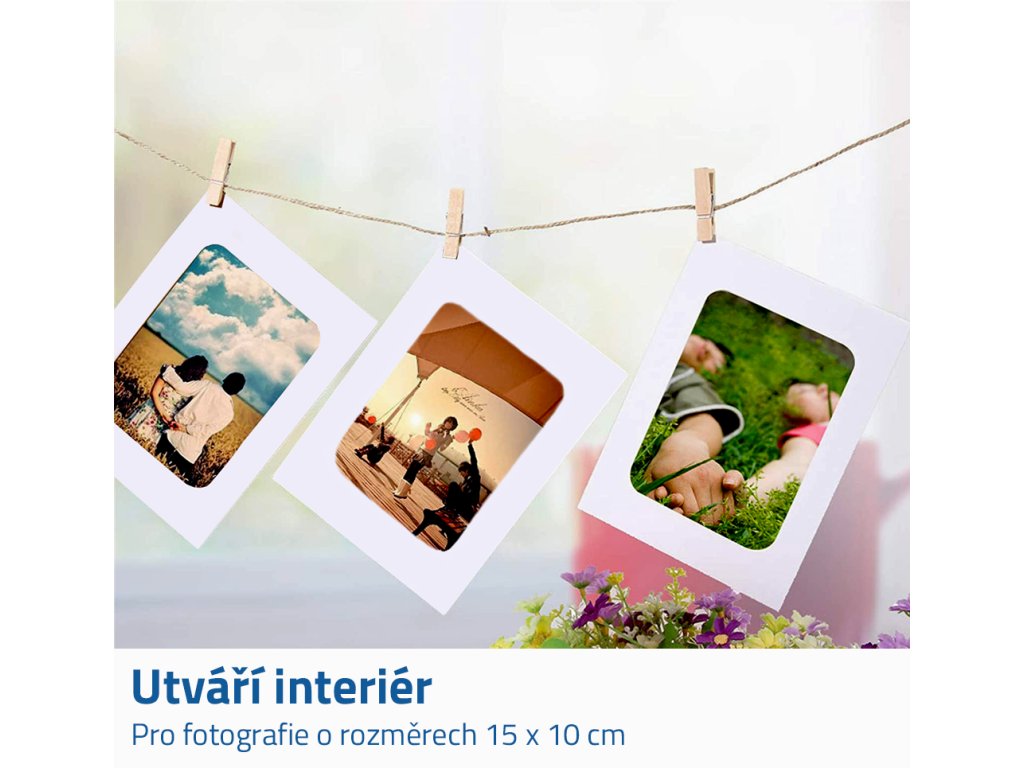 Rámečky jsou k dostání v bílé barvě, a díky okrajům do nich můžete vložit fotografie o rozměrech 15 x 10 cm. Vložte své vzpomínky do rámečků, které stačí zavěsit pomocí kolíčků (součást balení) na provázek třeba nad postel či jinam na zeď.